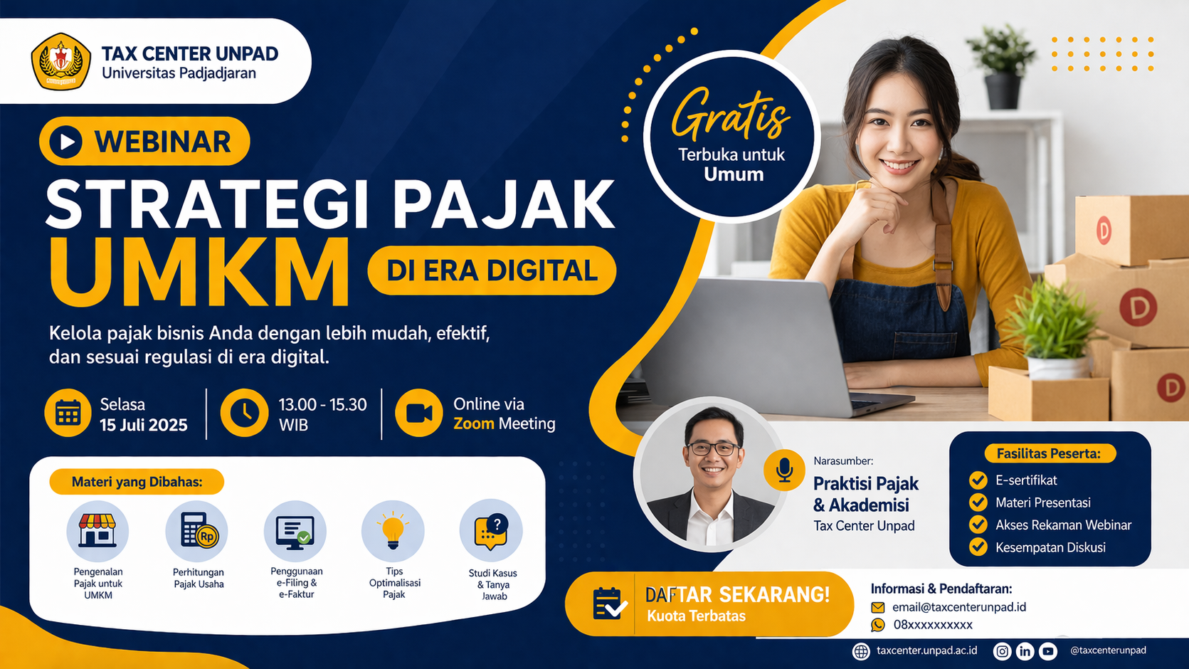 Tax Center Universitas Padjadjaran menyelenggarakan webinar perpajakan yang ditujukan bagi pelaku UMKM, mahasiswa, dan masyarakat umum untuk memahami strategi pengelolaan pajak di era digital.